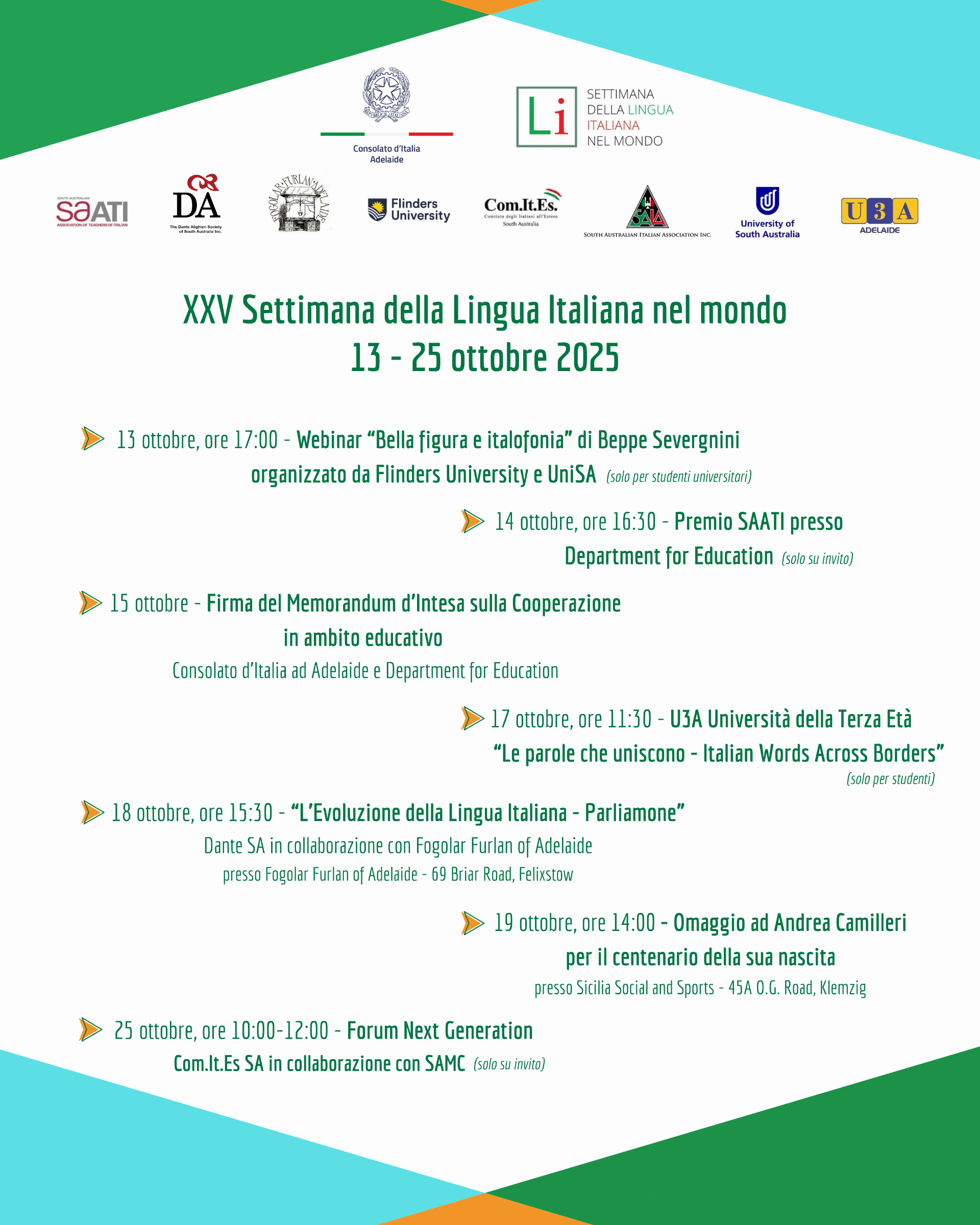 The week’s program includes activities and events designed, in an inclusive spirit, to showcase the richness and variety of Italian in its many different contexts. The events scheduled for Adelaide are listed in the flyer below.
